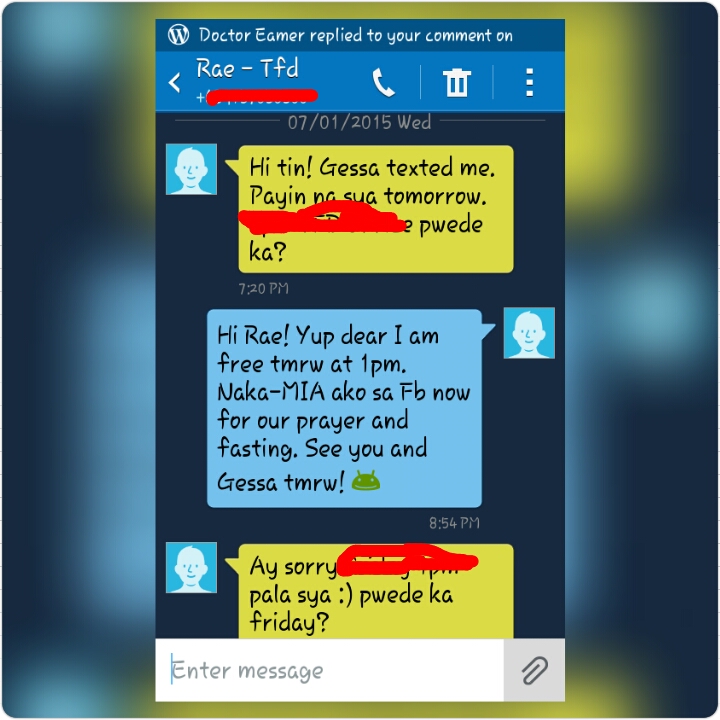 6pm is the time I lift my “cellphone off” ban and I prepare for our 7pm prayer meeting. Last night, hailing a cab going to church and my travel time were easy. But tonight, it was a challenge. I got out of the house and saw that heavy traffic started to build up in front of our house. I waited for 15 minutes but no cab was available. I haven’t eaten for the rest of the day and I thought, this might be the enemy trying to prevent me from attending the prayer meeting.