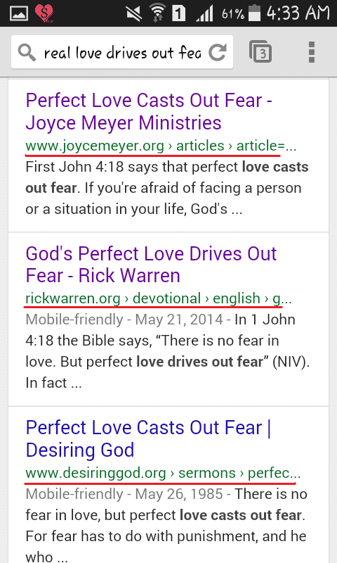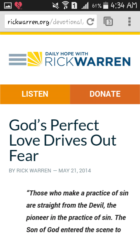 And I smiled even more when upon seeing the search results, the top 3 sources that came up were from the ministries that I highly look up to as a Christian: Joyce Meyer, Rick Warren and Desiring God. I don’t believe in coincidences and I believe God has a reason for waking me up at this hour. So I started reading all 3 articles by said authors and I found 3 words common in all 3 articles: perfect love, God’s love and fear.