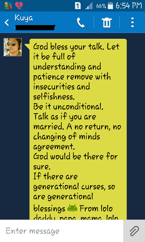 Both our answers were a “yes.” The agreement was then mutual. Apologies were said and accepted, love overruled. So there we were continuing on from where we ended. When I made this re-commitment, I felt that I was making a pledge that indeed, no matter what happens, like what my brother said, there’s no more backing out. Fight for faith, continue hoping and most especially fight for love.